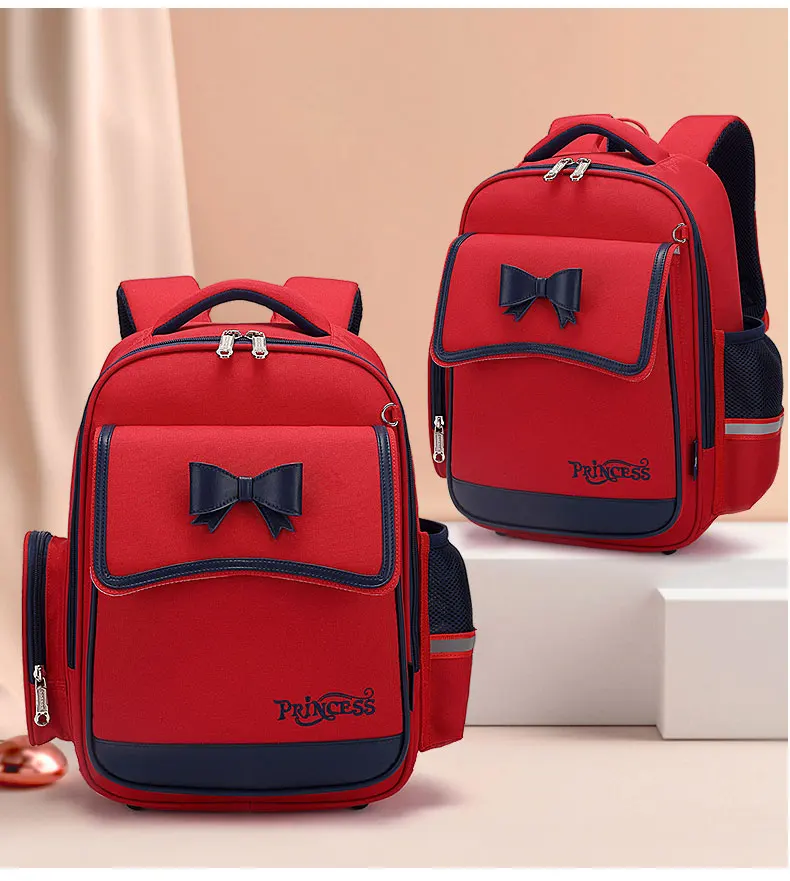 Krásný školní batoh pro dívky, který má na přední straně mašli.